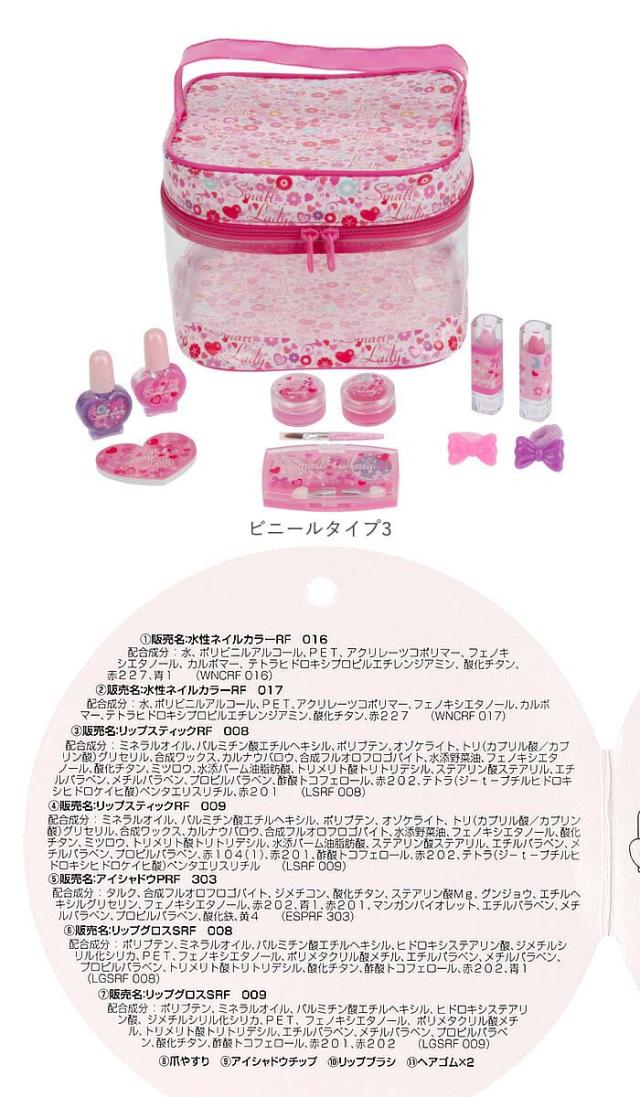 | 商品説明 | ・お化粧ごっこが楽しくなる「スモールレディ ビニールバニティ メイクボックス」が登場! ・コスメやアクセサリーなど女の子の憧れを一つのボックスにまとめたバニティーボックス♪ ※カラーによりセット内容が異なります。 ・ネイルカラーは大人用の物とは違い、より安全で水で簡単にオフできる水溶性タイプ! コスメはノンクレンジングで石けんだけで落ちる◎お子さまの繊細なお肌に優しい作り。 ・可愛いボックスはコスメを使い終わっても、小物や小さなおもちゃ入れに最適♪ ※カラーによりボックスのデザインが異なります。 【セット内容】 [ビニールタイプ] ・リップグロス(6個)、リップスティック(2個)、ネイルカラー(4色)、へアゴム(10個)、リング(2個)、ステッカー(2枚) [ビニールタイプ2] ・リップグロス(1個)、リップスティック(1個)、ネイルカラー(2色)、チークカラー(2色)、アイシャドウパレットチップ付き(3色入り1個)、爪やすり(1個)、チークブラシ(1個)、ヘアクリップ(2個) [ビニールタイプ3] ・リップグロス(2個)、リップスティック(2個)、ネイルカラー(2色)、アイシャドウパレットチップ付き(3色入り1個)、爪やすり(1個)、リップブラシ(1個)、ヘアアクセサリー(2個) ・お誕生日や入学祝いのギフトにもおススメ。(対象年齢:6歳以上) |