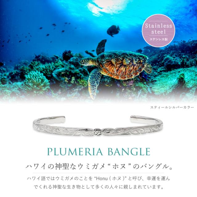 ハワイの神聖なウミガメ“ホヌ”のバングルです。素材には金属アレルギーに配慮したサージカルステンレス316Lを使用しています。 ペンダント裏面には名前や日付、メッセージなど無料で刻印をお入れすることができるので、誕生日、記念日、クリスマス、バレンタインデー、父の日など特別なギフトにおすすめです。【スティールシルバーカラー】