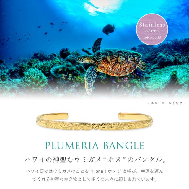ハワイの神聖なウミガメ“ホヌ”のバングルです。素材には金属アレルギーに配慮したサージカルステンレス316Lを使用しています。 ペンダント裏面には名前や日付、メッセージなど無料で刻印をお入れすることができるので、誕生日、記念日、クリスマス、ホワイトデー、母の日など特別なギフトにおすすめです。【イエローゴールドカラー】