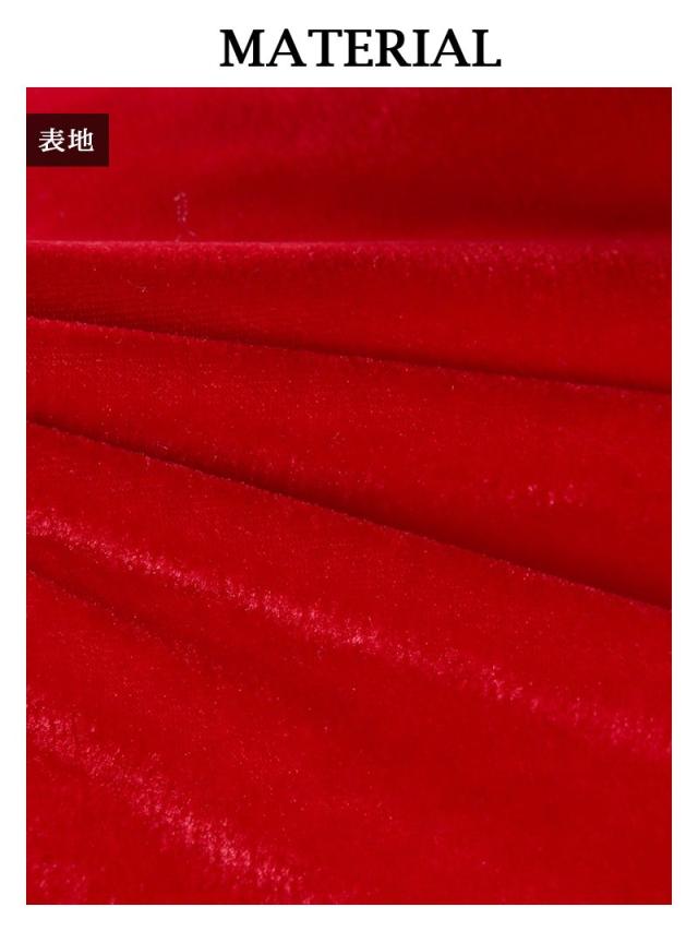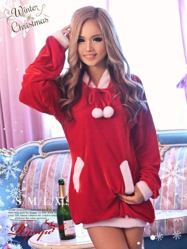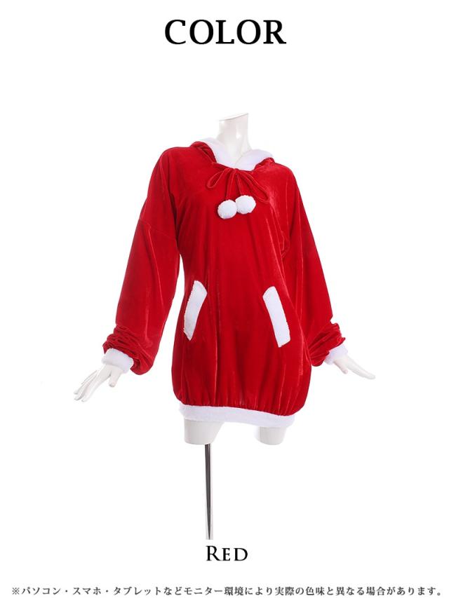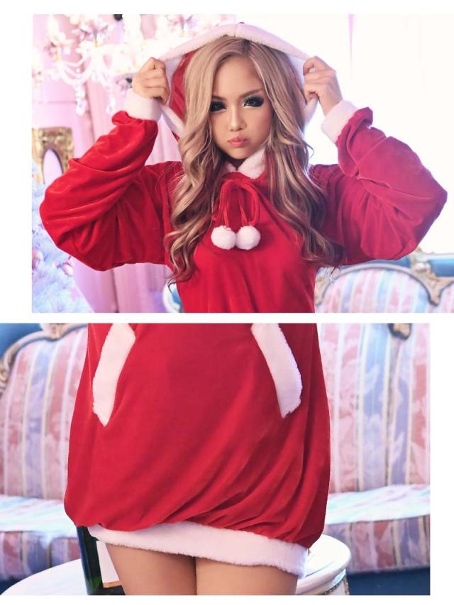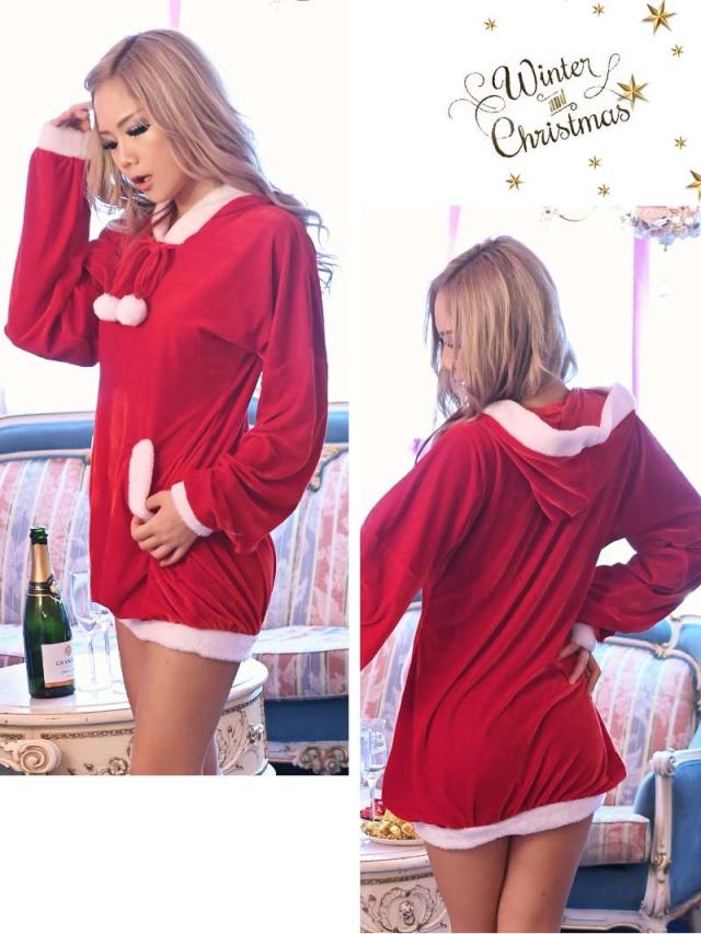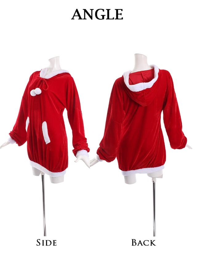 ☆裾しぼりになっている長袖キャバサンタワンピースは、ふわぴた袖が愛らしくさらにフード付きデザインがあざと可愛く着れちゃうサンタコスチューム♪