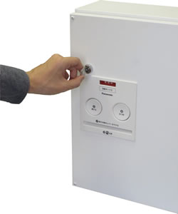 1・「使用中(赤色)」表示の場合、付属の専用キーでシリンダー錠を回し、扉を開けます