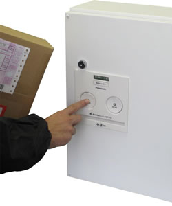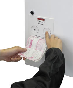 3・伝票差し込みに伝票を入れ、4・「なつ印」ボタンを押して捺印し、伝票を取り出して荷物受け入れ完了です