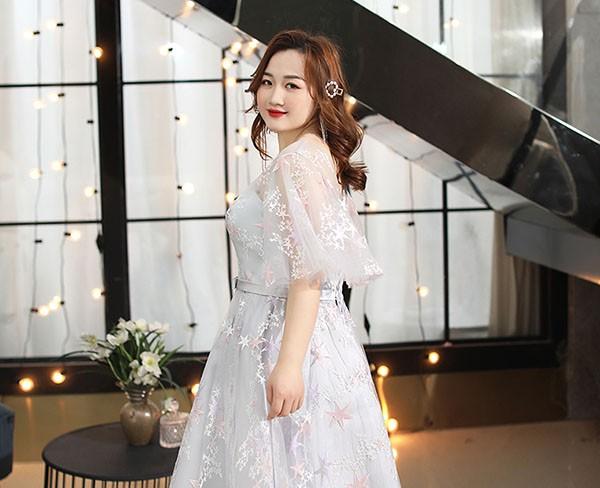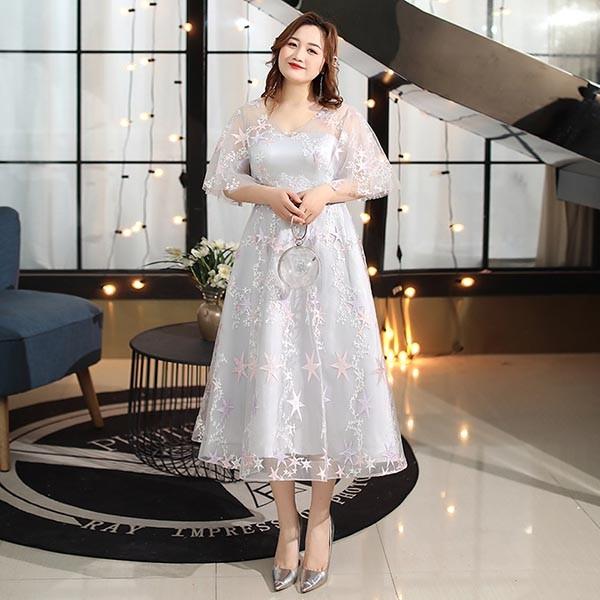 ドレス 大人 ピアノ 発表会 演奏会用ドレス イブニングドレス ピアノ発表会 ロングドレス 母親 結婚式 パーティードレス 五分袖 袖あり ミモレ丈 透明感 Vネック 成人式 同窓会 二次会 ワンピース ぽっちゃり 大きいサイズ 上品 3L 4L 5L 6L 7L グレー dp097t2t2c0