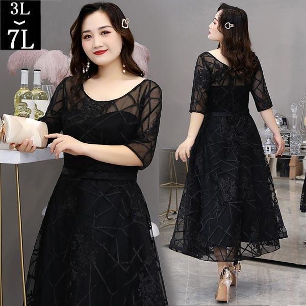 ドレス 大人 ピアノ 発表会 演奏会用ドレス イブニングドレス ピアノ発表会 ロングドレス 母親 結婚式 パーティードレス 五分袖 袖あり ミモレ丈 透明感 成人式 同窓会 二次会 ワンピース ぽっちゃり 大きいサイズ 上品 3L 4L 5L 6L 7L ブラック 黒 dp098t2t2c0