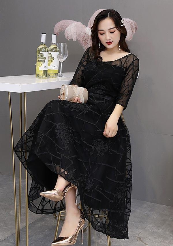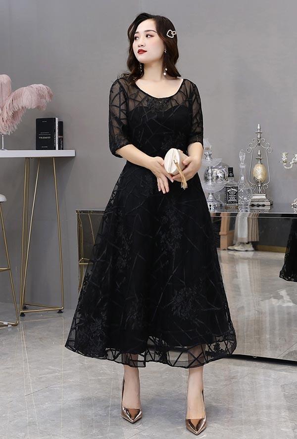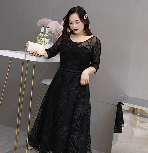 【送料無料】ドレス 大人 ピアノ 発表会 演奏会用ドレス イブニングドレス ピアノ発表会 ロングドレス 母親 結婚式 パーティードレス 五分袖 袖あり ミモレ丈 透明感 成人式 同窓会 二次会 ワンピース ぽっちゃり 大きいサイズ 上品 ブラック 黒