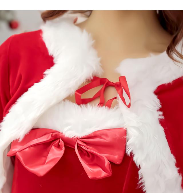 七分袖のジャケットとベアトップのミニ丈フレアワンピがキュートなサンタ。