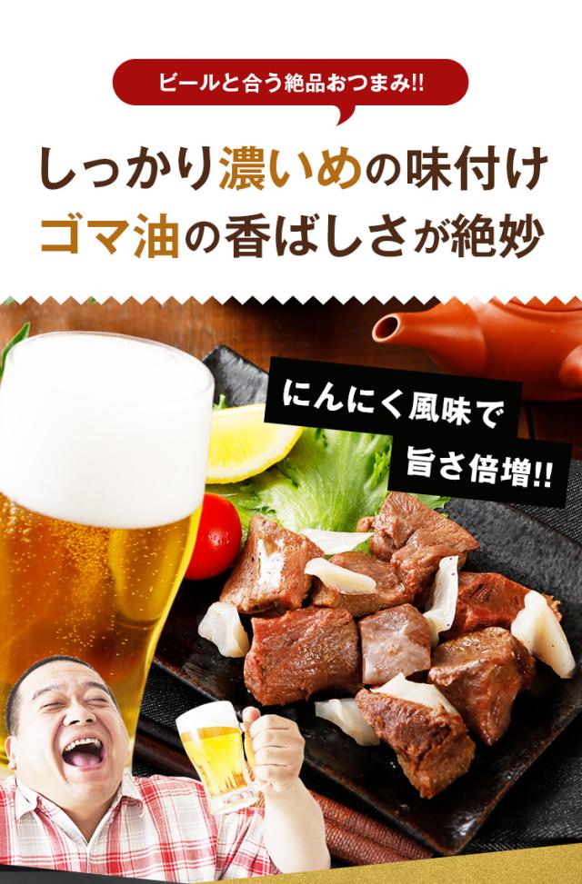 ■原材料名:牛ホルモン、こんにゃく、ごま油、にんにくおろし、食塩、濃口醤油、ブラックペッパー/酒精、pH調整剤、増粘剤(キサンタン)、調味料(アミノ酸等)、カラメル色素、甘味料(サッカリンNa、カンゾウ)、ビタミンB1、(一部に小麦・大豆・牛肉を含む)
