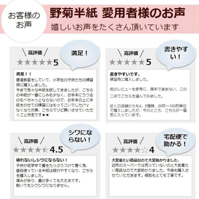●野菊半紙の特徴:十川製紙製造直販の滲みが少ない国産習字半紙です。和紙のような柔らかな風合いを大切に作りました。