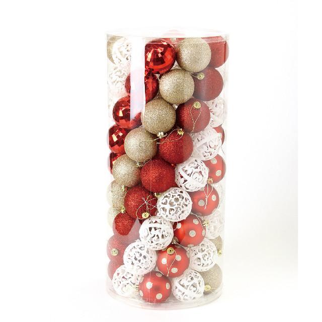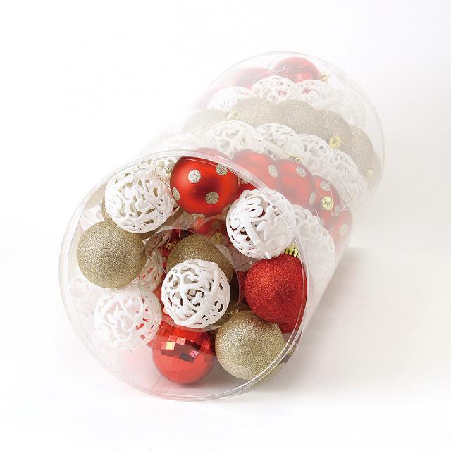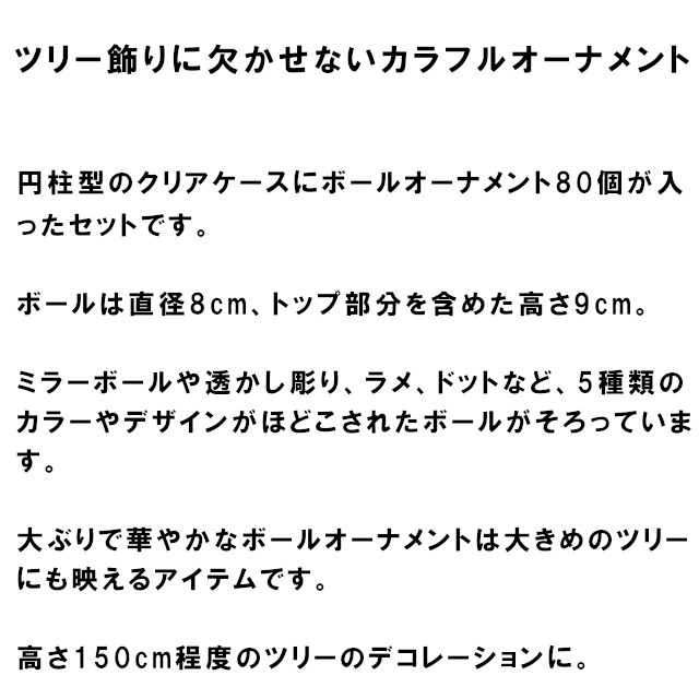 円柱型のクリアケースにボールオーナメント80個が入ったセットです。