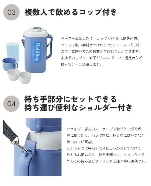 | 2Lのペットボトルがそのまま入るペットボトル用クーラーです。 市販の角型2Lペットボトル・丸型1.5Lペットボトルが入ります。 ドリンクを水筒に入れる手間がなく、保冷剤付きで冷たさが持続できます。 遠足・運動会・キャンプなどマルチに活用できます。 ショルダー付きなので持ち運びに便利です。 ドリンクを注ぐ際に便利なハンドル付き。 クーラー本体以外に、コップ×3と保冷剤が付いています。 |