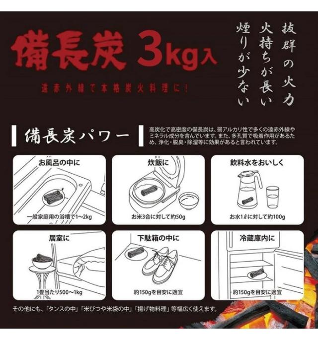 | 火持ちは長く、煙は少なく、抜群の火力の備長炭3kg入りです。 遠赤外線で本格炭火料理をお楽しみいただけます。 様々な場所に脱臭材としても使えて便利です。 |