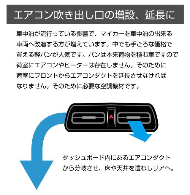 ・自動車のエアコン吹き出し口を増設、延長できるエアコン/ヒーター長方形型ツインルーバーです。 ・車中泊が流行っている中で、本製品はマイカーをカスタマイズして低価格のキャンピングカー仕様にできます! ・エアコンダクトから分岐させてリアへ送ることで、より快適な空間になります。 ・DIY用なので、自分だけのオリジナルな空調設備を作ろう! |