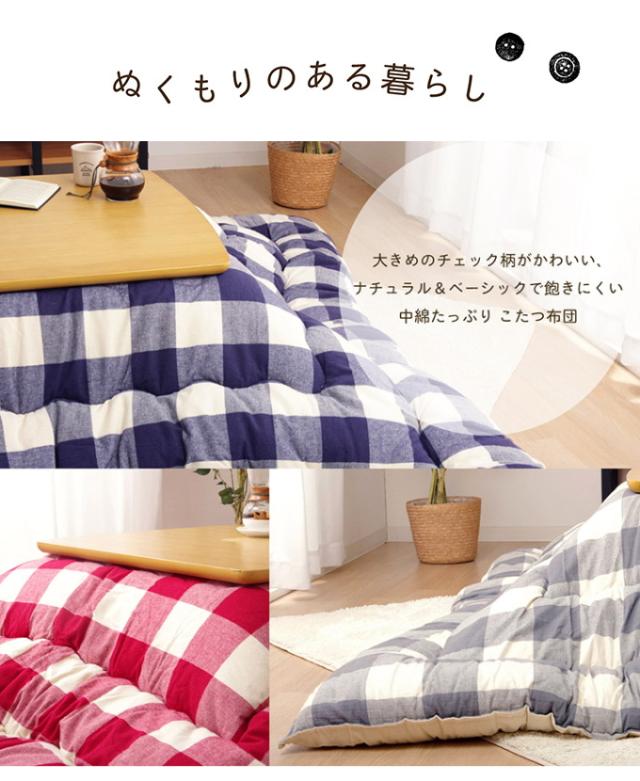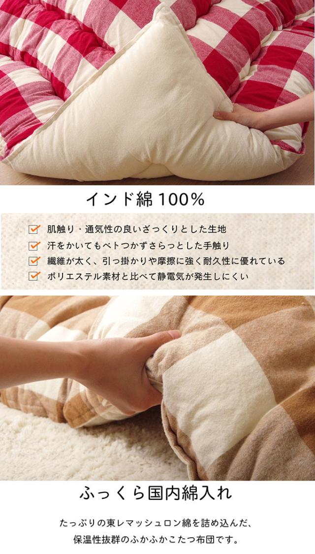 インド綿100%の生地を使用したふかふかのこたつ布団。 お部屋のテイストを選ばず、飽きのこないナチュラル&ベーシックなデザインです。 ざっくりとした生地は肌触りや通気性が良く、さらっとした手触り。 インド産の綿は繊維が太く耐久性に優れており、引っ掛かりや摩擦に強い素材。 また、綿素材はポリエステル素材に比べ、静電気も起きにくいのが特徴です。 【こたつの特徴】 1.省エネルギー こたつは必要なところだけを温める省エネ暖房器具です。 こたつの部分使用は電気代もおトクに。 2.クリーン こたつは二酸化炭素など有害物質を出しません。 3.団らんの場 家族や友達が一緒にくつろげる空間。心もポッカポカになります。 |