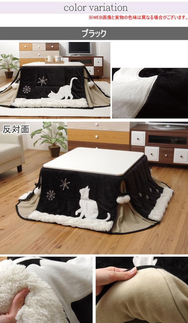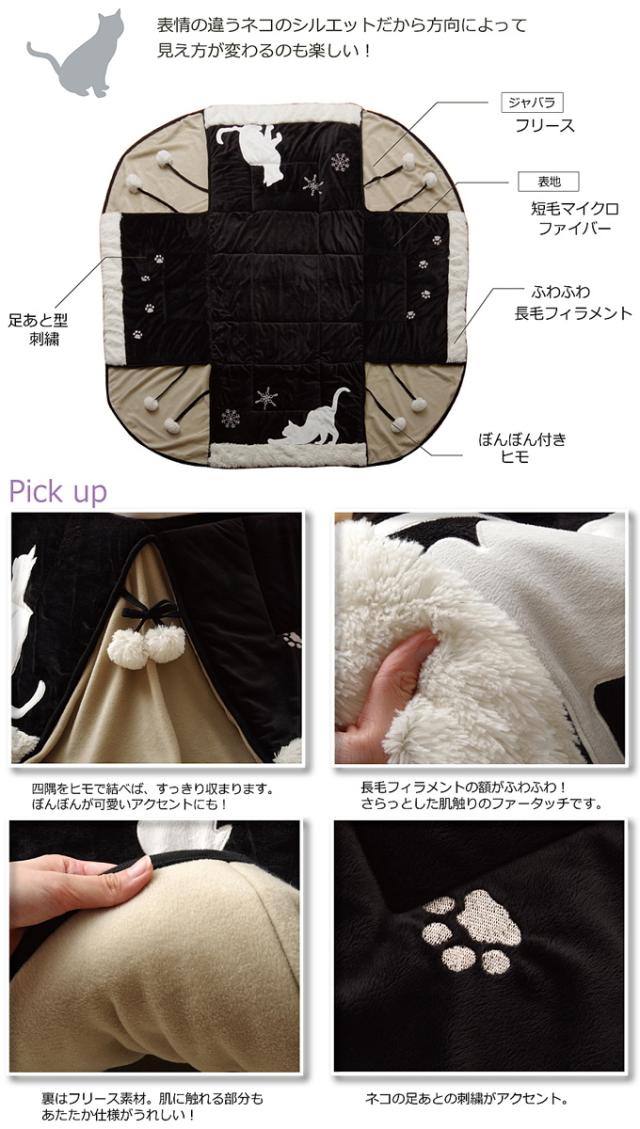 ネコ柄シルエットがかわいいコンパクトな省スペースタイプのこたつ用掛布団。 角が膨らまないのでお部屋を広く使えます。 雪の結晶はプリントではなく刺繍で表現することで、甘くなりすぎずシックな雰囲気に。 表地には耐久性に優れ、しっとりとやわらかな短毛のマイクロファイバー生地を使用。 薄手で折りたたんでもかさばらないのに、裏地のフリース生地で保温性が高く軽い仕上がりになっています。 色はシックなブラックとやわらかなベージュの2色展開です。 |