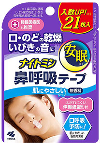 ナイトミン 鼻呼吸テープ 肌にやさしいタイプ 21枚×2個セット【小林製薬】はがれにくい伸縮波型形状 口・のどの乾燥・いびきの音に 無香料【訳あり特別価格】