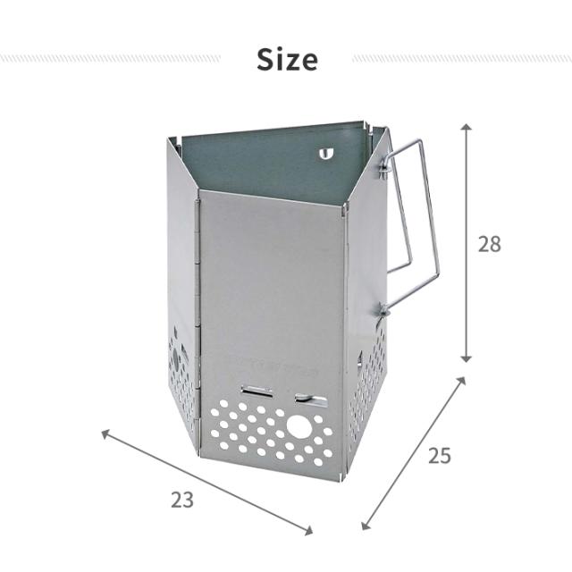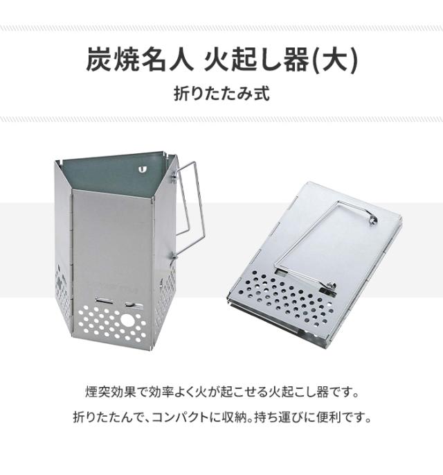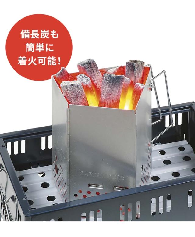 | 備長炭も着火できるカンタン火起こし器です。 収納は超薄型なので持ち運びラクラク。 空気の対流を促進させ、燃焼効率が飛躍的に向上します。 煙突効果で効率良く炭が起こせます。 |