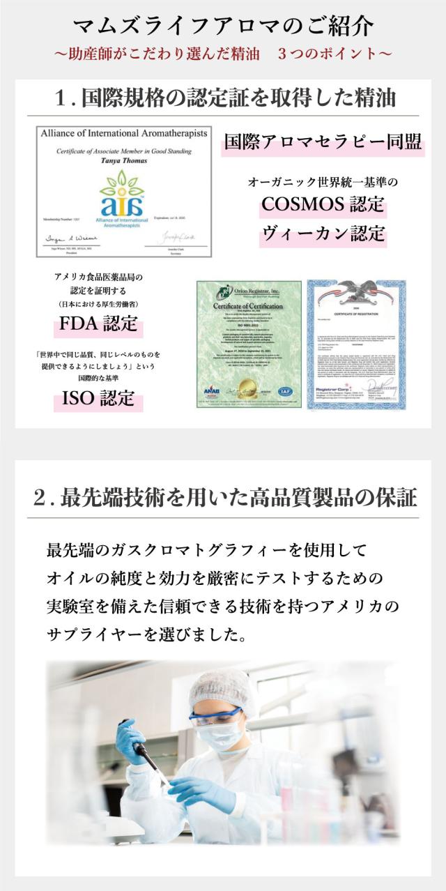 【認定書】当店のエッセンシャルオイル「mom"s Life aroma」は、国際アロマセラピー同盟、FDA認定、ISO認定、COSMOS認定、ヴィーカン認定を取得した精油を取り扱っています。