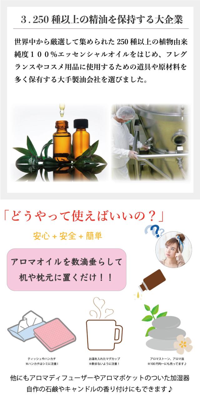 【免責事項】アロマセラピーは医療行為に代わるものではありません。また、精油は医薬品、医薬部外品、化粧品ではありませんので精油は正しくお使いください。妊娠中の方、持病がある方、アレルギーをお持ちの方、他に身体の健康状態で気になる方は必ず事前に医師に相談の上、指示に従ってください。当店はアロマセラピーに関する行為によって生じた一切の負傷、損傷、その他についての責任は負いかねますので、十分にお気をつけてご使用ください。