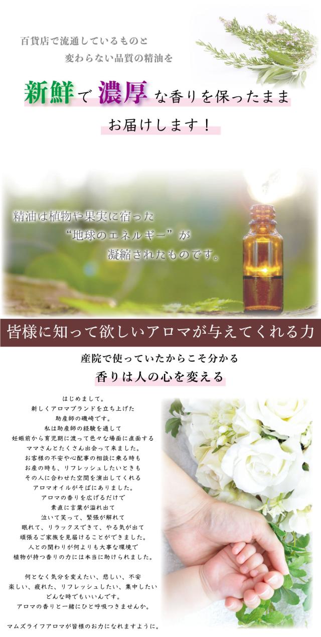 【特徴】マムズライフアロマシリーズ商品はすべて、合成香料などを添加していない100%ピュアなエッセンシャルオイルです。アメリカの大手製油製造会社より直接輸入しています。メジャーなオレンジやラベンダーをはじめ、人気だけど単品販売が多いフランキンセンスやベンゾイン、少しマイナーだけど香りのベースになったりアクセントに使えるアニスやバジル、バルサムコパイバを取り扱っています。さらに、妖艶な香りで有名なイランイランやパルマローザ、ワシントン条約規制により製造が困難とされるローズウッドの代用精油であるホーウッド、他にもマジョラムスイートやバーチスイートなどなかなか他では安価で手に入らない希少価値のあるアロマオイルを幅広く取り揃えております♪芳香浴やオリジナルブレンドを作ってみたり楽しみ方は様々。この機会にぜひお試しください。