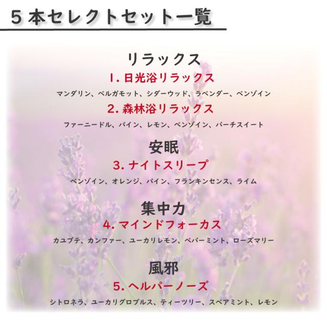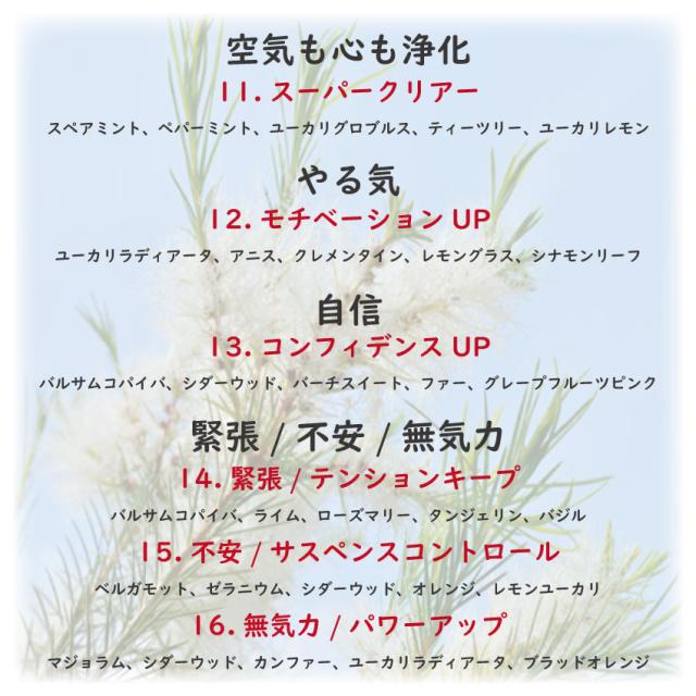 目的別スターターセット全16種(1.日光浴リラックス/2.森林浴リラックス/3.ナイトスリープ/4.マインドフォーカス/5.ヘルパーノーズ/6.ルームクリーン/7.エネルギッシュ/8.リカバリー/9.イライラバスター/10.リフレッシュ/11.スーパークリアー/12.モチベーションUP/13.コンフィデンスUP/14.テンションキープ/15.サスペンスコントロール/16.パワーアップ)