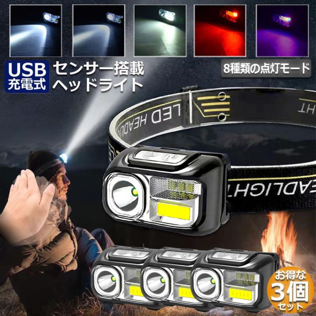 ヘッドライト 充電式 ledヘッドライト 3個セット アウトドア用ヘッドライト SOSフラッシュ 8つ点灯モード 軽量 角度調整可 防災 停電時用 登山 夜釣り キャンプ アウトドア ハイキング