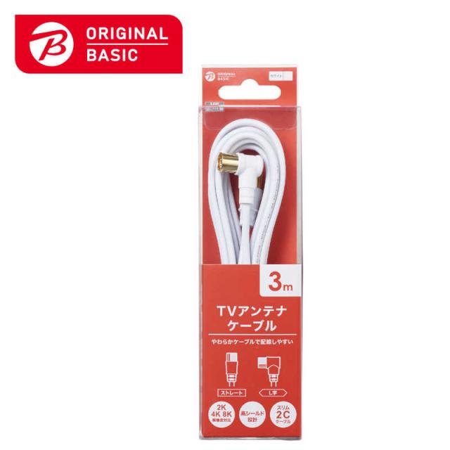 ORIGINALBASIC 4K8K対応 テレビ用アンテナケーブル 3m ホワイト L型プラグ-ストレートプラグ OB-TCSL2C30WH