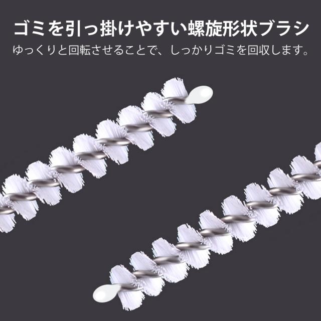 【ゴミを引っ掛けやすい螺旋形状ブラシ】ゆっくりと回転させることで、しっかりゴミを回収します。