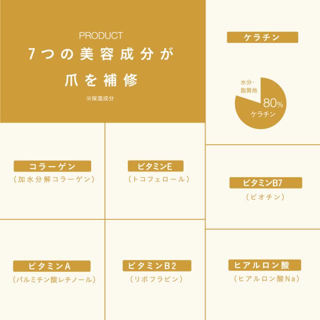 主な美容成分:ケラチン、コラーゲン、ヒアルロン酸、ビタミンA、B2、B7、E
