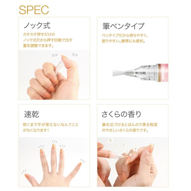 筆ペンタイプで塗りやすくネイルが苦手な人も簡単。速乾なので忙しい人も、いつでもどこでもネイルケアできます。
