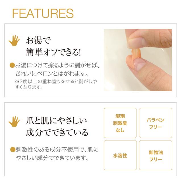 お湯でペロリと剥がせるので、除光液で爪を傷める心配もありません。