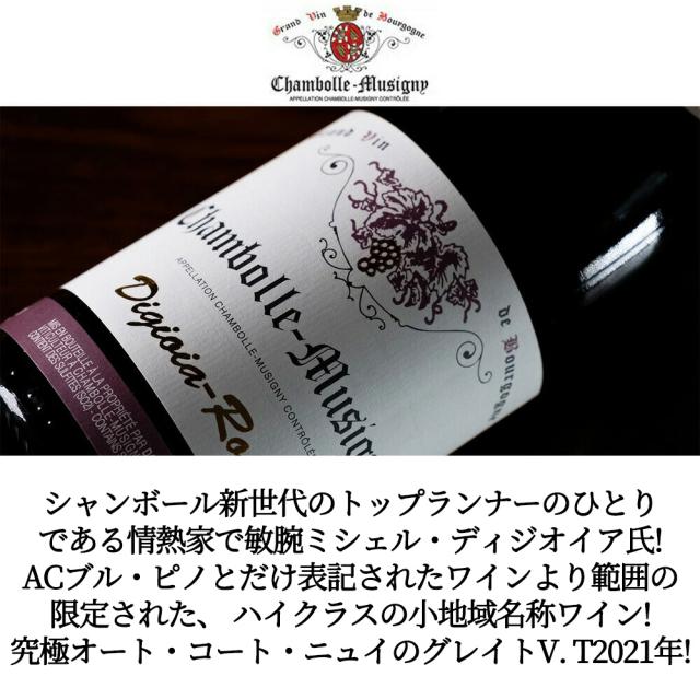 シャンボール新世代のトップランナーのひとりである情熱家で敏腕ミシェル・ディジオイア氏!ACブル・ピノとだけ表記されたワインより範囲の限定された、 ハイクラスの小地域名称ワイン!究極オート・コート・ニュイのグレイトV. T2021年!