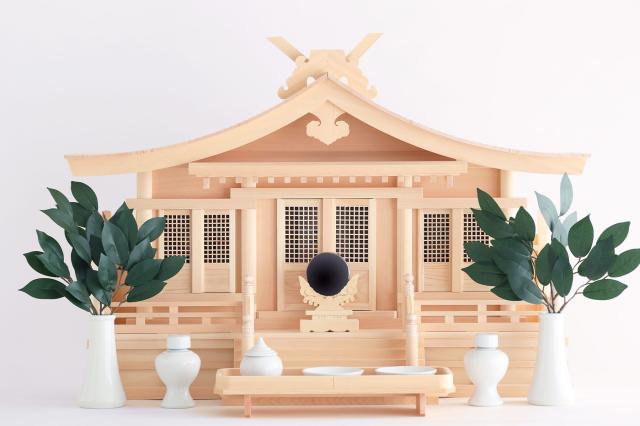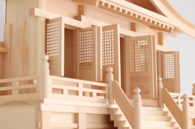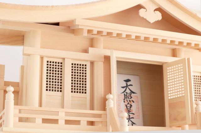 桧材の頂点、木曽桧で作られた神棚は、職人の木工技術が集約された最高級品として、木肌の美しさを強調する構造と工芸品のたたずまいを持ち合わせています。
