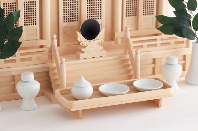神具も逸品を 神具は基本の国産セット、滑らかな質感、瀬戸焼の陶器となっています。神鏡は真鍮製の鏡、お社と同じ木曽桧材を彫り込んだ台座、神社と同じ工程の職人作りです。お膳も木曽桧製、大事なお供え神具も逸品で揃えています。 |