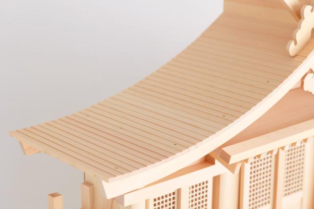 「切妻」と「大社造」の様式、流れる曲線の屋根は出雲大社本殿をイメージする外観。三枚の格子扉は清楚で厳かな雰囲気を漂わせます。お社本体へは装飾金具類は取り付けておらず、木の風合いをたっぷり活かして仕上がった、当店オリジナル・限定数作成のお社となっています。