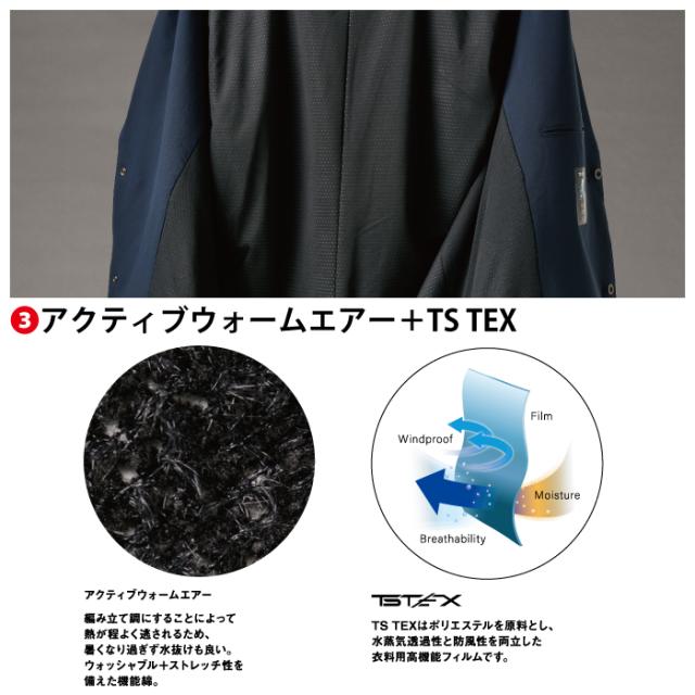 ◇素材:TS4Dストレッチ(P100%、耐久撥水加工)+TS TEXフィルム+アクティブウォームエアー(機能中綿)