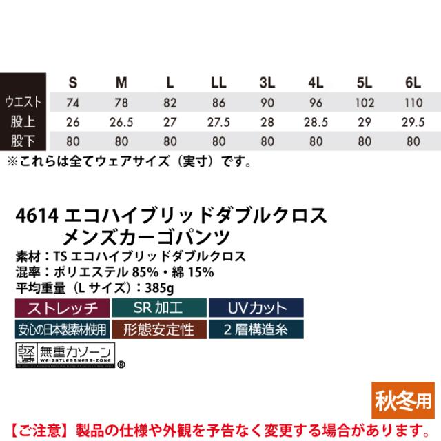藤和 TSDESIGN 作業服 秋冬用 4614 エコハイブリッドダブルクロスメンズカーゴパンツ S-LL