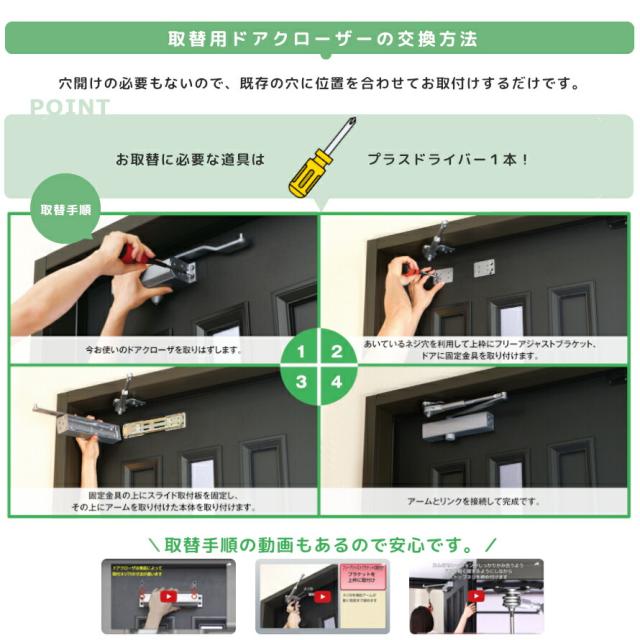 - ドアクローザーが壊れてしまい、近所のホームセンターを見たら一万円オーバー。このまーけで見たらほぼ半額でいい買い物ができました。