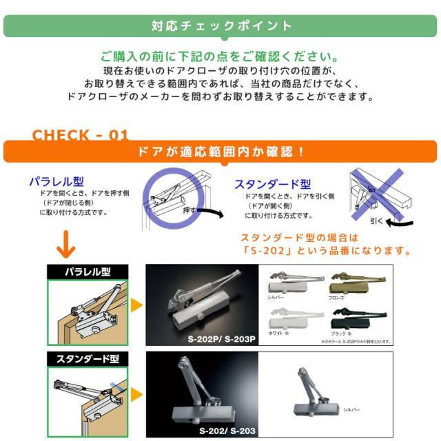 【土日祝発送可】【全国送料無料】リョービ S-202P / シルバー・ブロンズ パラレル 万能取替用 左右兼用 ドアクローザー ドアチェック 交換 取替 ストップ付 ドア重量45kg以下 一般住宅 玄関 勝手口 RYOBI S202P