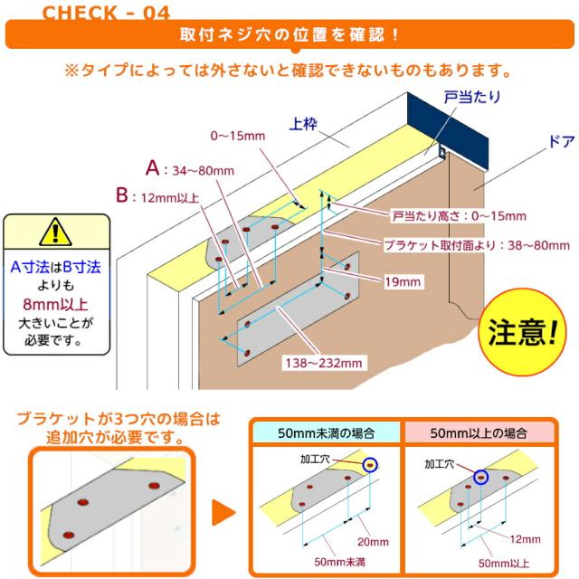 - ドアクローザーのブラケット側取付部分がドアのフレームに隠れていた為に外せずそのまま使用しましたが問題なく取り付け出来て良かったです、ただ色が違う所は仕方ないです。