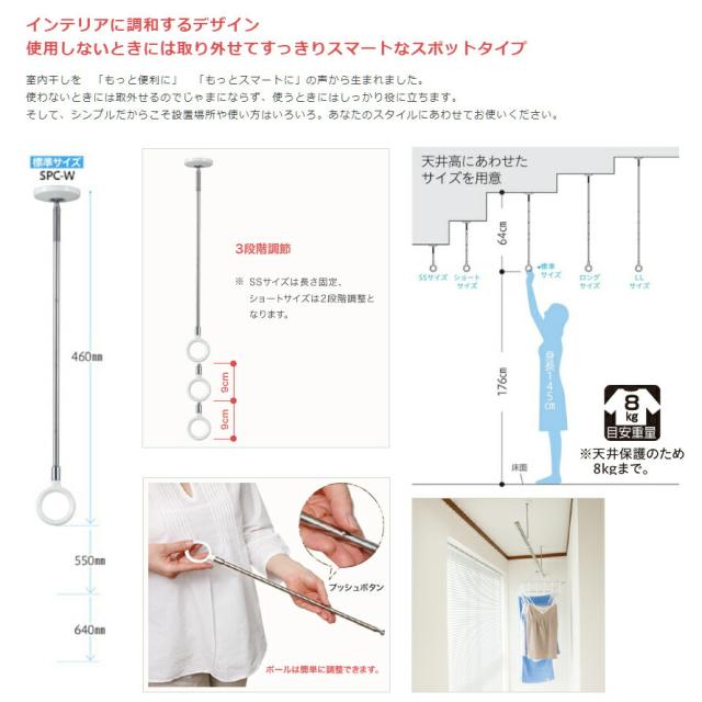 | スポット型の室内用物干し。 薄さ13mmの、美観に優れたスマートタイプ。 室内干しを「もっと便利に」「もっとスマートに」の声から生まれました。 使わないときいは取り外せるのでじゃまにならず、使うときにはしっかり役に立ちます。 そして、シンプルだからこそ設置場所や使い方はいろいろ。 あなたのスタイルにあわせてお使いください。 天井高にあわせてサイズを選択。さらに使いやすい高さに調整が可能。 ※ボタンを押してポールを伸縮させるだけの簡単操作です。 ※「SPCSS-W」は調整なし。「SPCS-W」は2段階調整です。 |