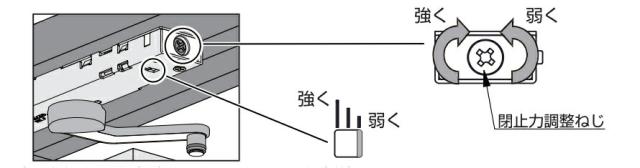 | お取り付け後、閉止力調整ねじを回すことによりダンパーの強弱を調整できます。扉が最後まで閉まらない場合や、逆に強く閉まってしまうような現象を解消します。調整ねじは回しすぎないよう、引き込み力を実際に確認しながらドライバーでゆっくりと行います。 |