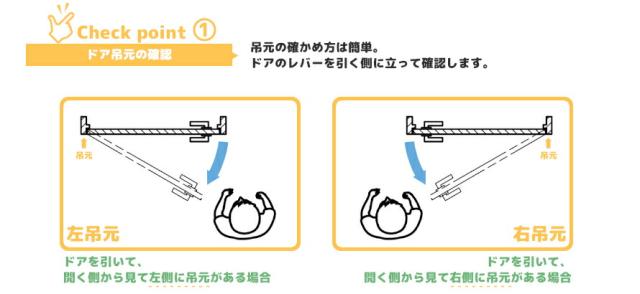 | ●【左吊元】ドアを引いて開く側から見て左側に吊元がある場合 ●【右吊元】ドアを引いて、開く側から見て右側に吊元がある場合 |