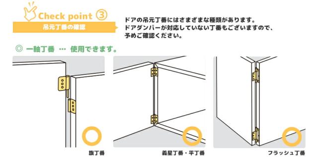 | ラプコンドアダンパーには左吊元用と右吊元用があります。吊元をお確かめの上、ドアの吊元に合った商品をご購入くださいませ。 |