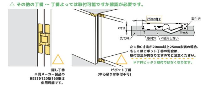 | ただし、ドア枠の"たて枠"寸法が20mm以上25mm未満の場合や、ピポット丁番をご使用の場合は、吊元側のたて枠から25mm離す必要があります。 |
