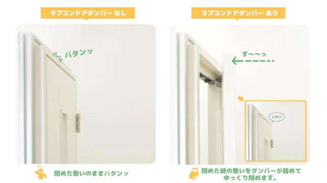 | 既存のドアに後付けが可能な、ラプコン(ダンパー機構)を搭載した室内開き戸用ドアダンパーです。 |