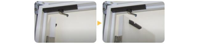 | ドアを閉めるとダンパー本体のアームが、扉側に取り付けた受座にゆっくりと納まり扉を閉めます。 |