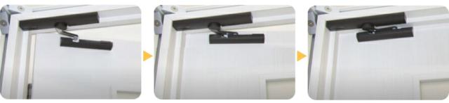| ドアを開くと、ダンパー本体のアームは受座から離れ、扉はフリー状態になります。ラプコンドアダンパーはドアクローザーとは違い、開止保持ができます。また、ダンパー機能をストップさせたい時は、アームを折り畳んで停止させておくことも可能です。 |