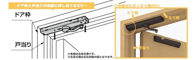 | ドア枠の"たて枠"寸法が25mm以上の場合は、本体を吊元側のドア枠の"たて枠"と"戸当り"に突き当て、指定の取り付け穴にて取付けます。 |
