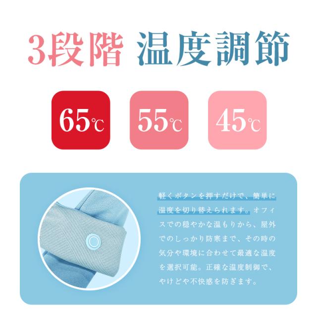 ワンボタンで簡単に3段階の温度調節が可能です。高温は約65℃で寒い日に最適。中温は約55℃で日常的な使用にぴったり。低温は約45℃で長時間の使用でも電気を節約します。