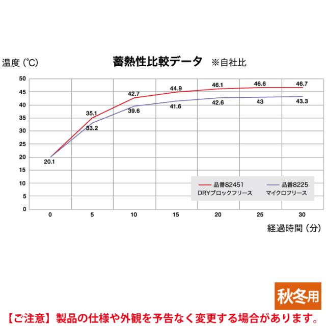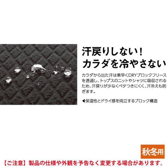 ◇カラダから出た汗は素早くDRYブロックフリースを透過し、トップスのニットやシャツに吸収されるため、汗戻りが少なくベタつきにくく、汗冷えも防ぎます。